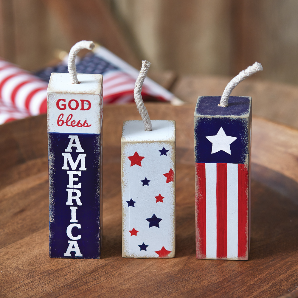 Crafted to ignite your festive spirit, each firecracker block showcases intricate designs that pay homage to Independence Day. These handcrafted decorative pieces blend seamlessly with any decor, adding a touch of spark and elegance to your living spaces. Each block is crafted from MDF. The smallest block measures 2''W x 2''D x 5''H and the medium block measures 2''W x 2''D x 6''H.