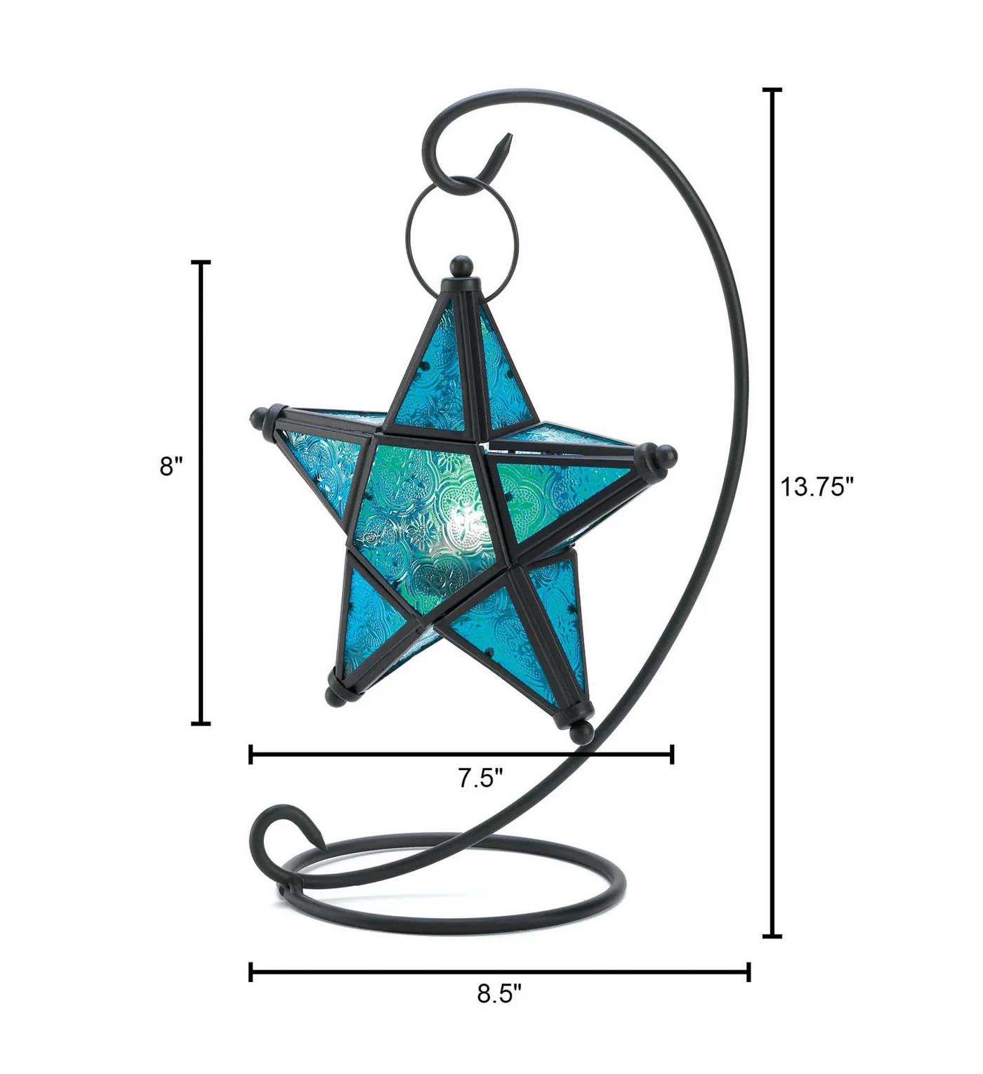 • Make a wish on this beautiful blue star! Simply add a candle to this lovely accent lantern to fill the area with an enchanting azure light. Beautifully fashioned from matte black metal and pressed glass for an artistic presentation.